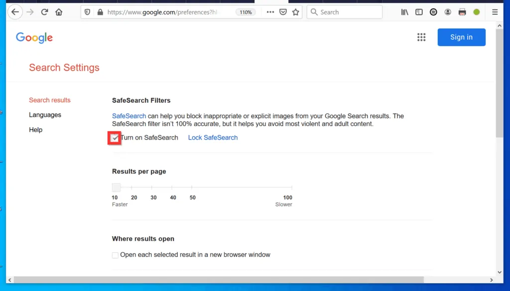 - To confirm that Safe Search is turned off, return to Google search settings. The checkbox beside Turn on SafeSearch will be unchecked.