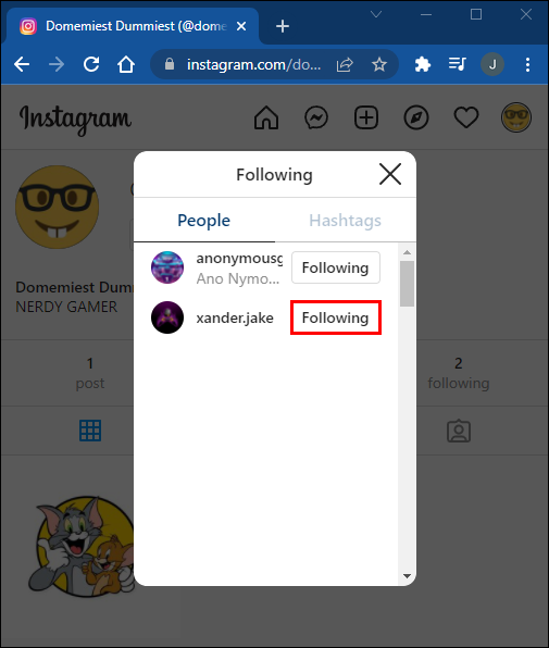 - Scan the list until you get to a profile you’re no longer interested in. Click the “Following” button next to the profile’s username.