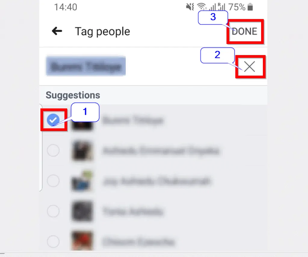 - All the people you tagged in the post will be listed on top. To untag someone, uncheck the blue tick beside the person’s name (labelled 1 below). To tag new people, check the box beside each new person you want to tag. When you finish, click DONE (3).