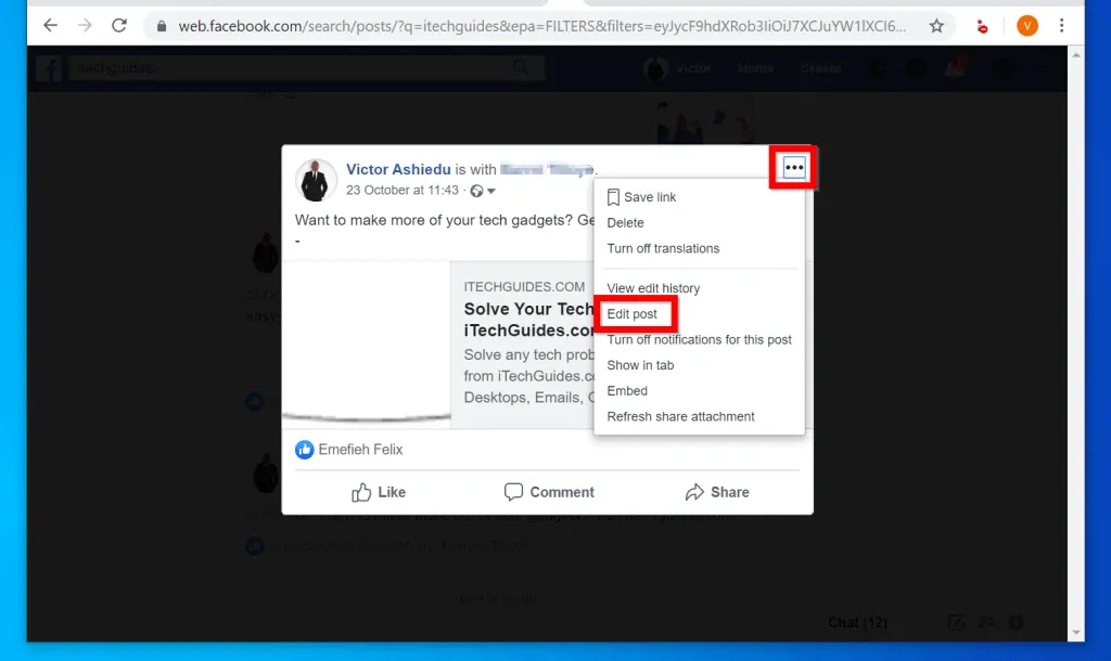 - When the post opens, on the top right, click the highlighted dots. Then click Edit post.