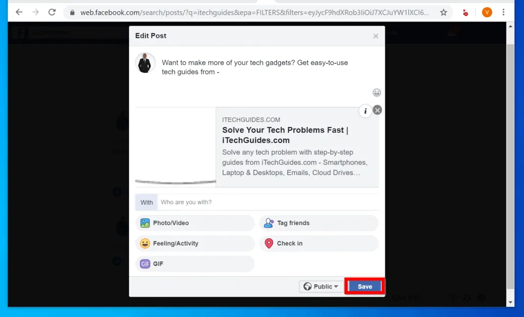 - The post will open in a Pop up window. To edit the post, on the top right of the pop up click the highlighted dots. Then click Edit post.