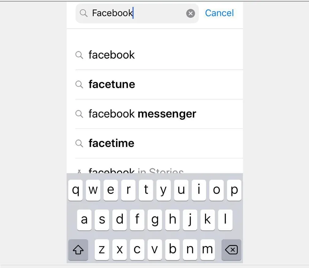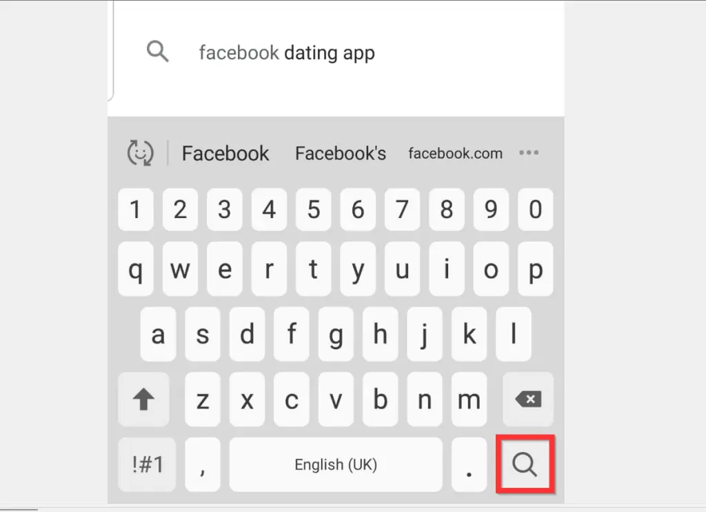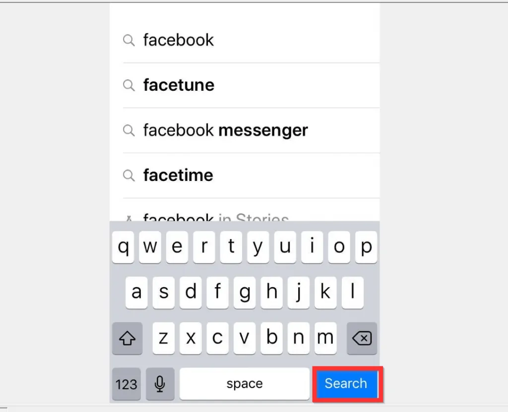 - Then, type Facebook in the search bar. To display search results, select Facebook from the suggested list or tab Search on your keyboard.