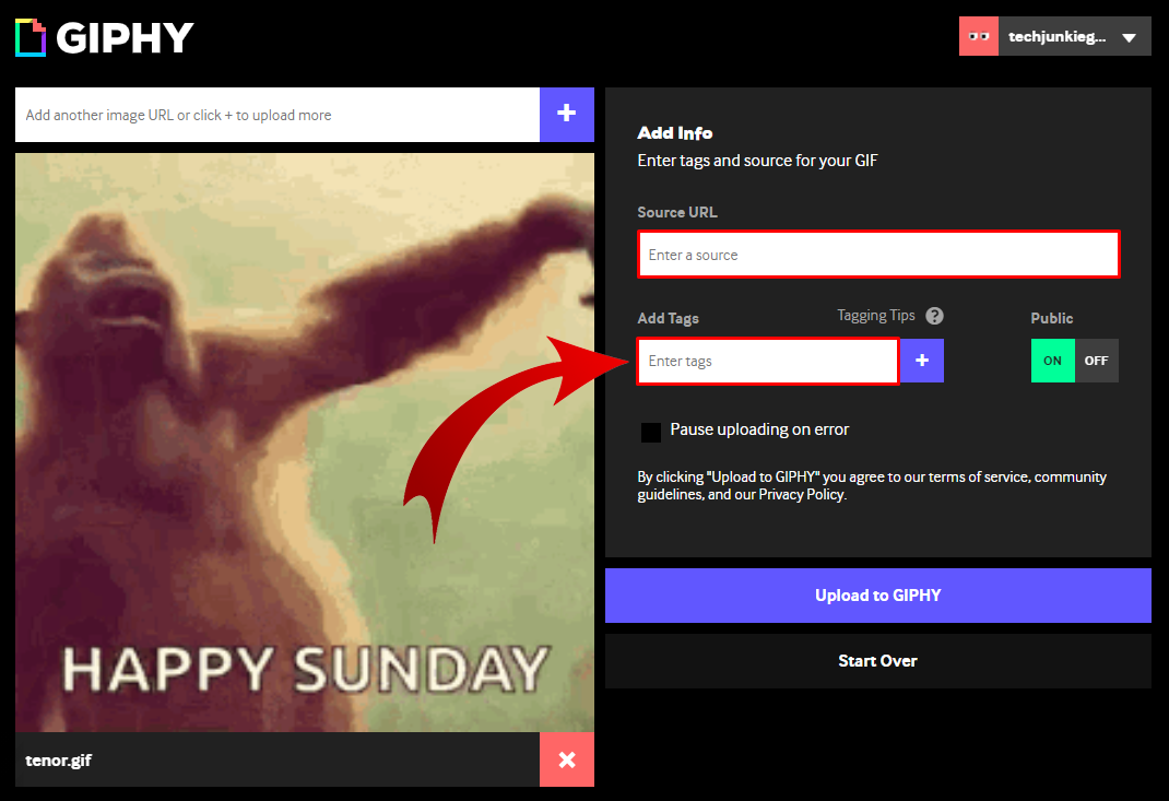 3) Select Add Tags to your GIFs, so you’re able to find them. If you’re not the creator, make sure you add the URL by clicking Add a Source URL.