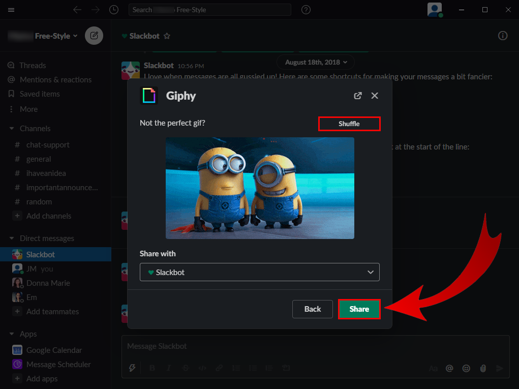 There isn’t a particular set of steps to take to preview GIFs in Slack. When you go to GIPHY, you will see a preview for every GIF before you send it. In the pop-up window where your GIF is displayed, you can choose to send it or keep browsing with the “Shuffle” button.