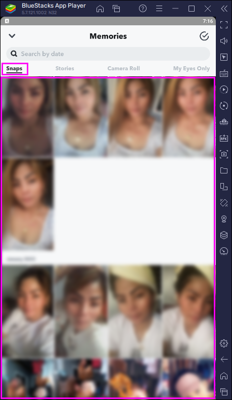 Your saved snaps will be organized into four categories: snaps, stories, camera roll, and “my eyes only.” They will also be organized by date, so you can go all the way back to the first saved snaps you ever made.