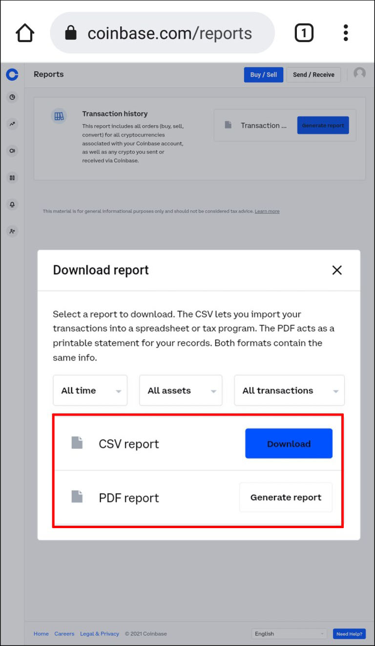 You’ll be able to filter data in the “All time,” or “All assets,” and “All transaction” boxes before generating the report.