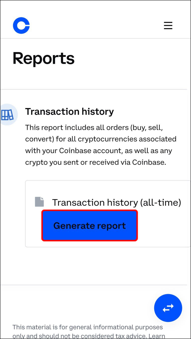 - When you see “Transaction history (all time),” select the button marked, “Generate report.”