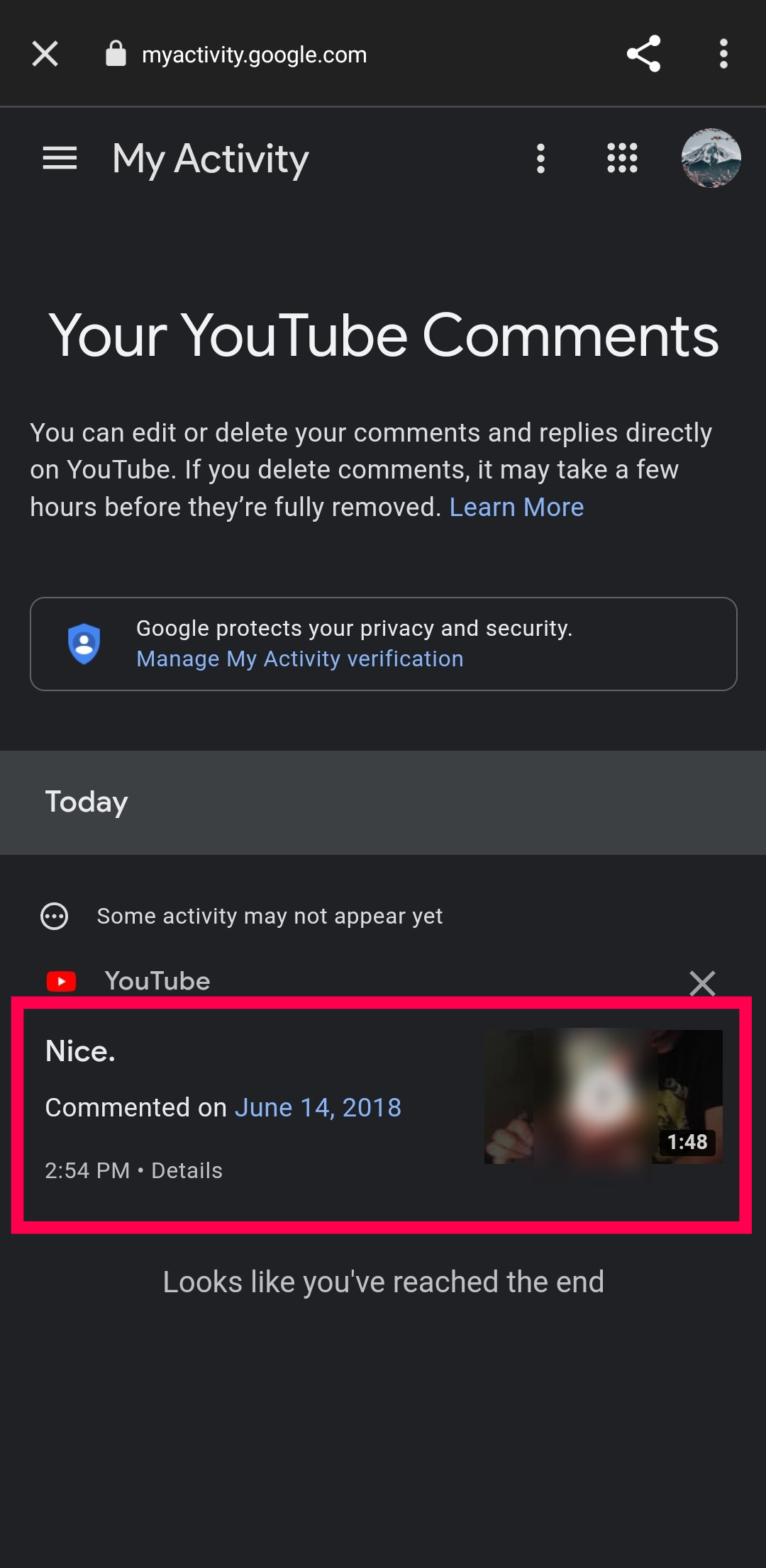 - Your Google “My Activity” menu loads on its “Your YouTube Comments” page.