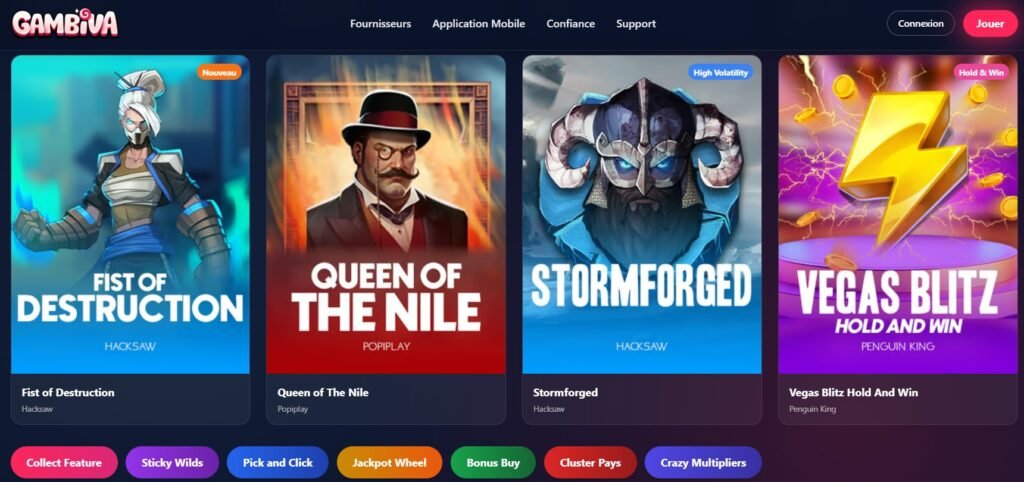 Oferta gier w Gambiva Casino jest imponująca i obejmuje ponad 1000 pozycji od najlepszych światowych dostawców, takich jak Pragmatic Play, Evolution Gaming czy NetEnt. Wśród nich na szczególną uwagę zasługują maszyny do gry z ogromnymi jackpotami oraz kasyno na żywo, gdzie gracze mogą poczuć prawdziwą atmosferę kasyna bez konieczności wychodzenia z domu.