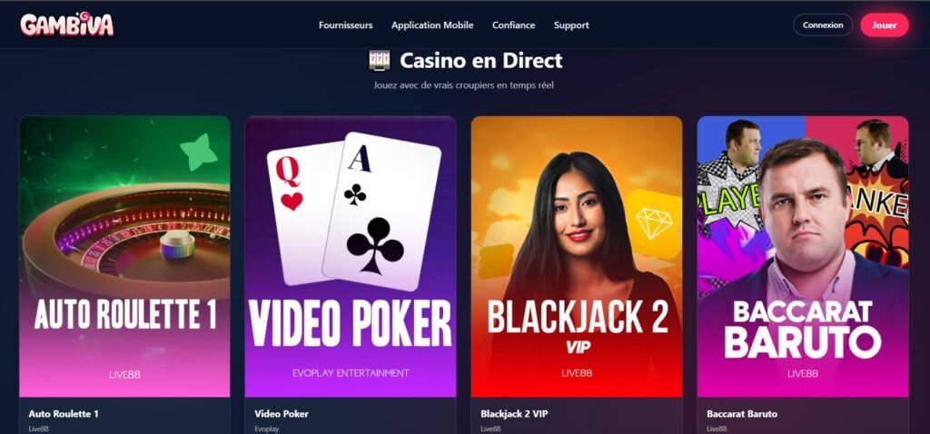 - Kasyno na żywo Gambiva: takie gry jak blackjack, ruletka i bakarat prowadzone przez profesjonalnych krupierów na żywo;