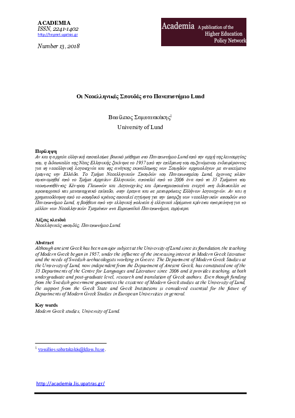 arrow_back_iosModern Greek studies at the University of Lund (full text in Greek)vassilios sabatakakisdownloadDownload free PDFAbstract