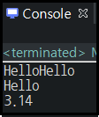 package tPrintWriter; import java.io.PrintWriter; public class Main { public static void main(String[] args){ PrintWriter pw = new PrintWriter(System.out); String str1 = "Hello"; pw.print(str1); pw.print(str1); pw.println(); // 개행 pw.print(str1); // 개행뒤 아랫줄에 출력 pw.println(); // 개행 pw.printf("%.2f", Math.PI); // 소숫점 둘째 자리까지 원주율 출력 pw.flush(); pw.close; } }위의 코드를 실행해 주면 아래와 같은 결과를 얻을 수 있다.