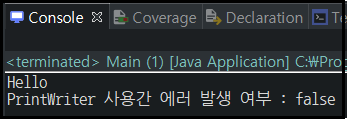 package tPrintWriter; import java.io.PrintWriter; public class Main { public static void main(String[] args){ PrintWriter pw = new PrintWriter(System.out); pw.println("Hello"); pw.flush(); boolean check = pw.checkError(); System.out.println("PrintWriter 사용간 에러 발생 여부 : " + check); } }위와 같은 방법으로 사용할 수 있으며, 오류가 발생하지 않으면 아래와 같이 false의 값을 리턴한다.