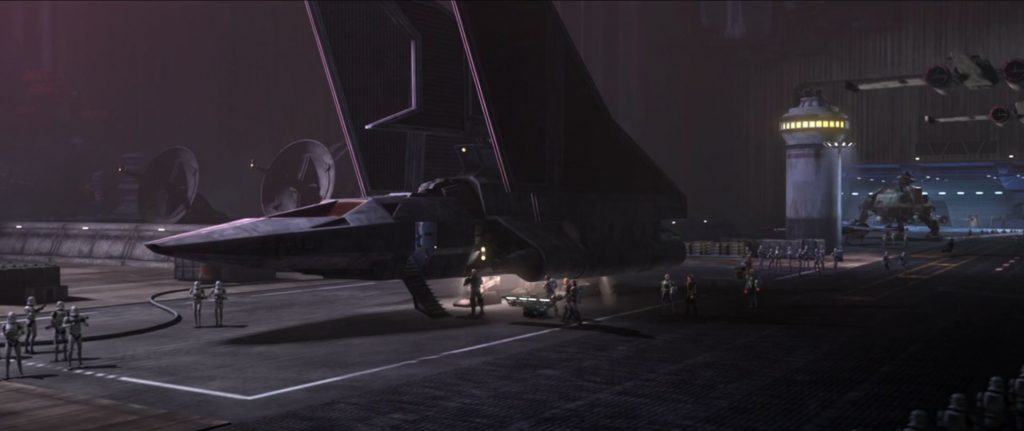 The “Bad Batch shuttle” depicts the Havoc Marauder, a customized Omicron-class attack shuttle. Although similar to the many tri-wing shuttles that appear throughout the entirety of the Star Wars canon, this shuttle is unique to the Bad Batch and first appeared with them in their debut episode on the final season of The Clone Wars.
