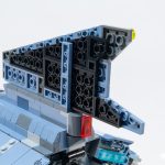 Since it’s built from plates rather than bricks (as the upper wings on LEGO Star Wars Imperial Shuttle sets typically are), the upper wing on the Bad Batch shuttle is studded on one side, with an anti-stud texture on the other. It’s also easy to attach backwards by accident. In fact, you may notice that we did exactly that, and unfortunately didn’t realize until after we’d shot the pictures, though even positioned properly it’s still quite ugly. The sublight engines follow the angles of the nacelles. With the wings up, the underlying Technic structure that makes the folding wings and their connections to the fuselage sturdy are highly visible. The fact that the 1×2 plate with Technic pinholes isn’t available in black makes them stand out even more.