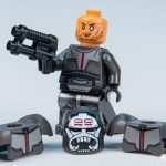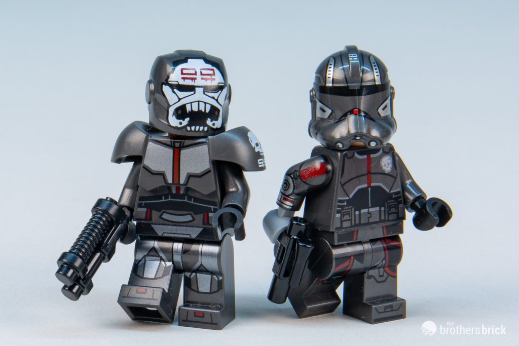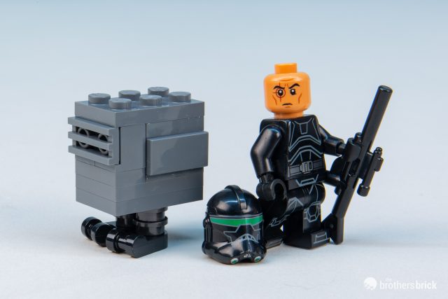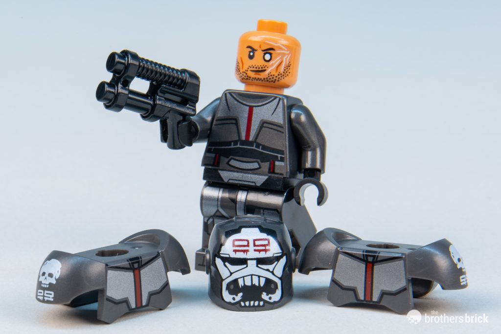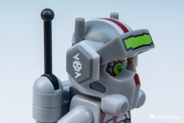 Echo’s complex helmet is likely impossible in LEGO, so a print that reflects the helmet’s narrow visor with printing is a good start, but the lack of printing on the back of the helmet to show the cybernetics is a little disappointing.