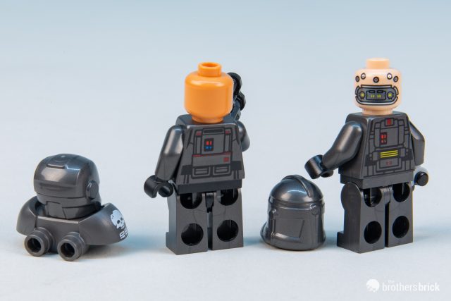 All of the minifigs are unique. Wrecker wears a uniquely printed Iron Man helmet rather than a clone trooper helmet. He wears large pauldron armor on his shoulders. In the animated series, Echo wears a custom helmet that fits over his cranial cybernetics. His cybernetic arm is depicted with arm printing (the only minifig with arm printing in the set) and a gray hand, though a pirate hook might have worked better.