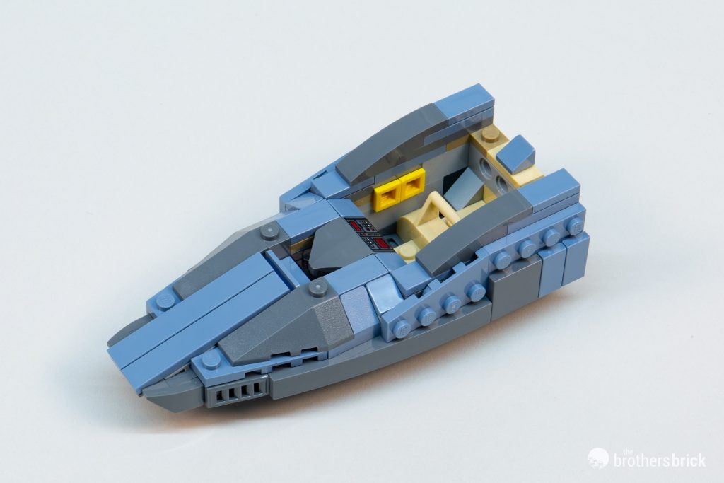 The “real” vehicle is large enough to feature a ramp that folds down from the cockpit section. By comparing the characters on the show entering and exiting through that hatch, it’s clear that the LEGO version is only about 1/3 minifig-scale.