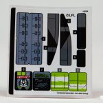 The sticker sheet itself features stripes, technical details, and display screens.