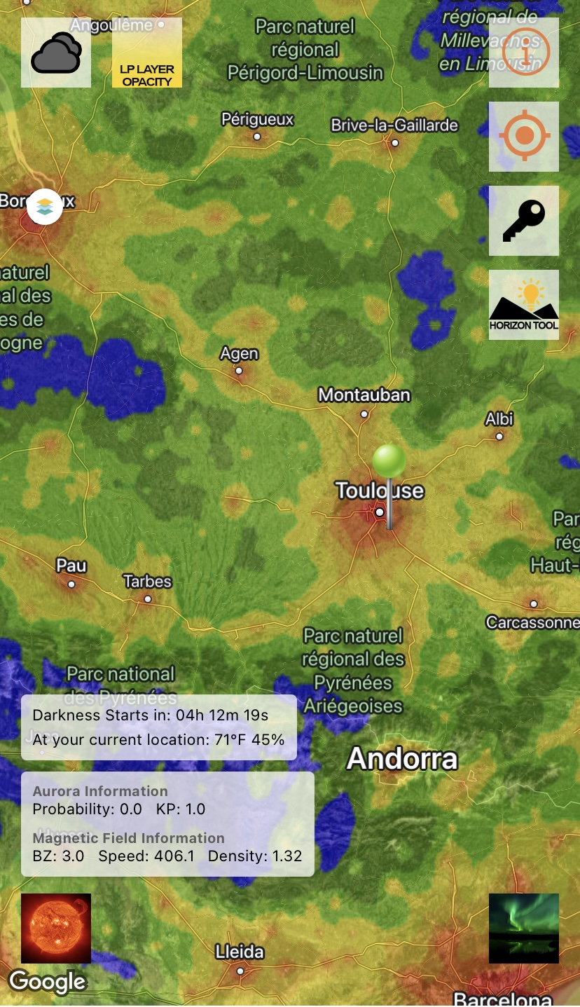 Un ciel dégagé ne rime pas nécessairement avec de bonnes conditions d'observation. Poser l'œil dans l'oculaire d'un télescope ou d'une lunette peut s'avérer décevant si la pollution lumineuse est trop élevée. Gratuite et disponible sur tous les supports, Light Pollution Map cartographie les zones les plus polluées par cette nuisance. Une palette de différentes couleurs permet ainsi d'identifier les régions subissant la pollution lumineuse et les secteurs les plus épargnés. Sans surprise, on constate ainsi que de nombreuses observations nocturnes sont dégradées à proximité de grandes villes telles que Toulouse, Lyon ou Paris. Light Pollution Map est utile pour les astronomes nomades en quête de lieux vierges de toute lumière artificielle. Les ciels les plus purs sont trouvables dans le centre de la France, dans le Quercy ainsi que dans les Pyrénées.
