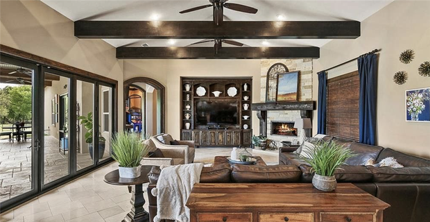 The living room is super Texas. The visible ceiling structures and antique-style wood contrasts well with the vibe of the interior and gives off the Lonestar State's western feel. The patio outside to the right is one of this home's most unique spaces.