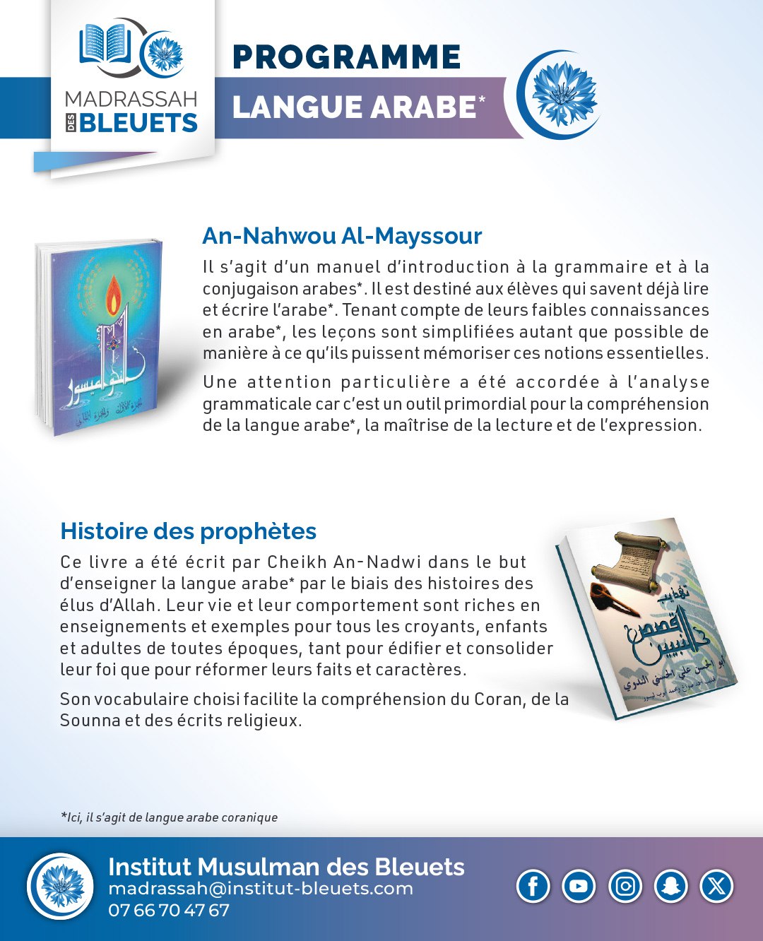 Les professeurs et le personnel responsable de l’Institut Musulman des Bleuets s’unissent main dans la main pour vous aider à acquérir ou approfondir vos apprentissages de la langue arabe coranique et du Saint Coran mais aussi à trouver une oreille attentive et une solution aux difficultés que vous rencontrez.