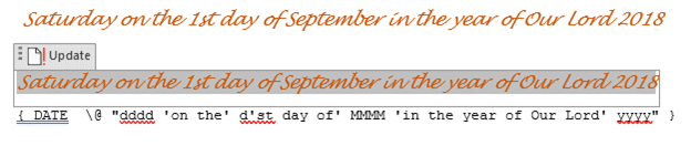 { DATE \@ "dddd 'on the' d'st day of' MMMM 'in the year of Our Lord' yyyy" }