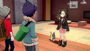 Marnie is first met in Motostoke's Budew Drop Inn, quelling a few disruptive Team Yell members with her presence. After apologizing to the player character, she attends the opening ceremony of the Gym Challenge. She later meets up with the player character at the same location prior to the third Gym Challenge, where she challenges them to a battle. Upon her defeat, Marnie notes that she has a long way to go.