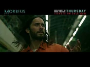 After the agents interviewed Bancroft, a nurse gets her blood sucked, with Morbius seeing the aftermath of the incident the next day when visiting his patient Anna. He rushes to exit the hospital, confronted by the agents. They are thwarted by Morbius' powers after trying to convict him, and he escapes to the roof of the building, halted by Stroud. He is then held prisoner at the Manhattan Detention Complex, where he writes about his incoming limit to artificial blood. In prison, Morbius is met by Milo posing as his lawyer, who promises to use his connections to have him freed. After Milo leaves without his cane, Morbius realizes he had taken the cure and most likely killed the nurse, and escapes from prison to confront him, hearing him kill a man who mocked Morbius for his original disability. Admitting he killed the nurse, but only due to the same bloodlust that caused Morbius to kill the ship's crew, Milo asks Morbius to join him in embracing their truer selves and live as vampires, before killing a group of police officers attempting to arrest Morbius and leaving.