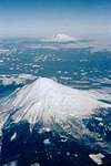 The current Mt. St. Helens VolcanoCam image. Even before May 18, 1980 when Mt. St. Helens blew its top sky-high while vaporizing a vast area to its north, it was the smallest of Washington's 5 volcanoes at 9677 ft (2950 m). The blast removed far more than that 1312 feet from the height of the mountain. It left a mere shell of what had been a beautifully symmetrical cone. The melting of several glaciers contributed to the massive floods. Sliding earth buried wonderful stands of virgin forest and recreational facilities and killed untold wildlife. A beautiful tree-lined lake was dammed to a higher level and filled with heat-stripped logs. Condensed rock vapor was carried on the wind to be deposited up to thousands of miles away. For seven years recreational climbing was banned on Mt. St. Helens. Then in May 1987 it was reopened. Only the south routes are still allowed. Access to the crater is strictly forbidden. On clear mornings I can see the mountain as I drive out of my neighborhood to work. That view is a constant reminder of the power of nature. I have always regretted that I had moved from Vancouver, WA to Juneau, AK only three months before the eruption. I returned two years after the eruption, but I missed out on all the excitement. When the mountain blew its top, a part of me went with it.