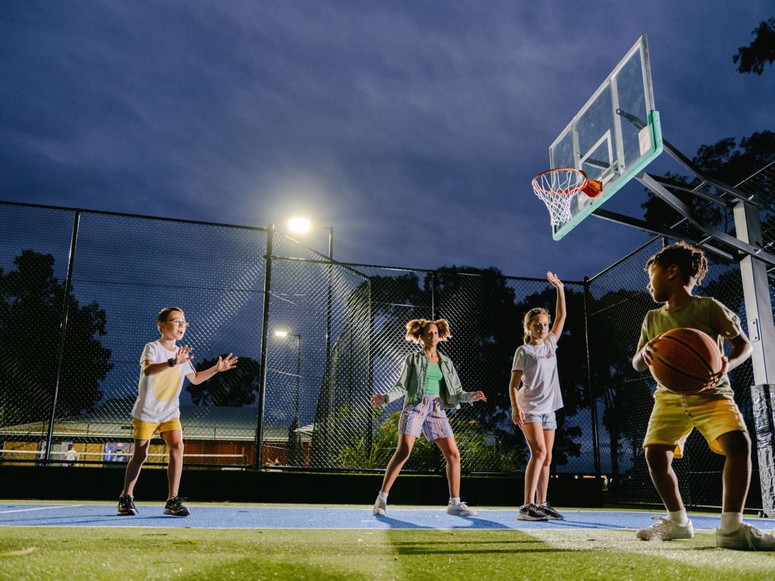 Basketball is one of many activities to enjoy on a camping trip. Location: BIG4 Sandstone Point, QLD.