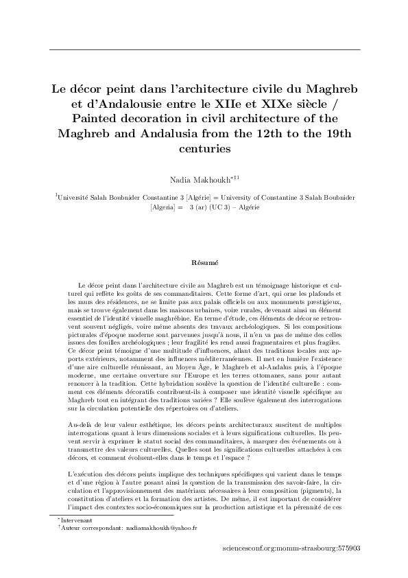 Appel à contributions | Call for papers 6e congrès des études sur le Moyen-Orient et les mondes musulmans 24-27 juin 2025 Strasbourg (France) Le décor peint dans l'architecture civile du Maghreb et d'Andalousie entre le XIIe et XIXe siècleNadia Makhoukh