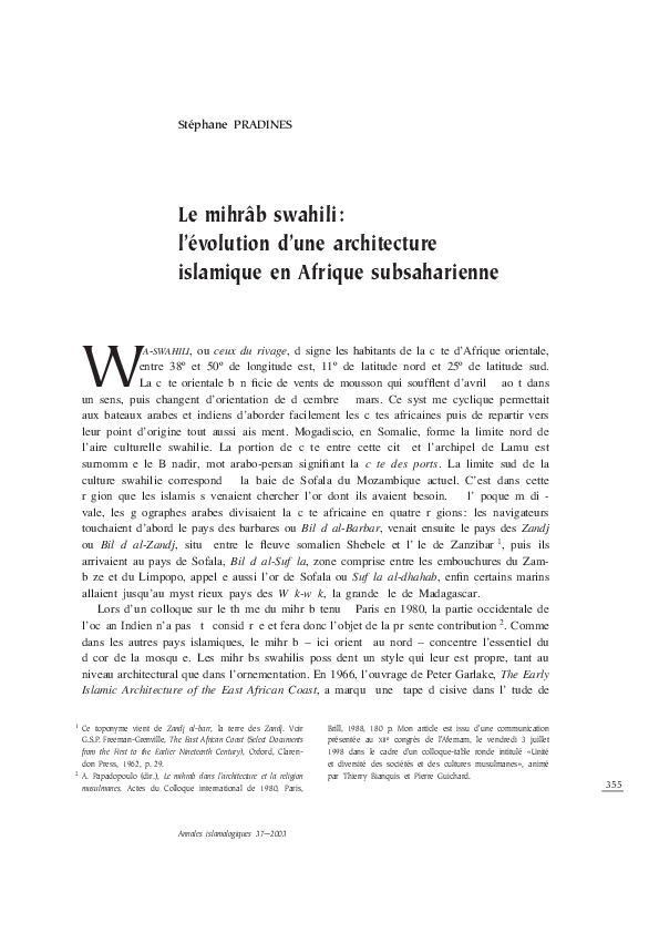 "Le mihrab swahili : Evolution d’une architecture islamique en Afrique subsaharienne", Stephane Pradines