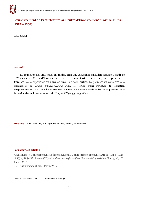 L'enseignement de l'architecture au Centre d'Enseignement d'Art de Tunis (1923 – 1930Faiza Matri