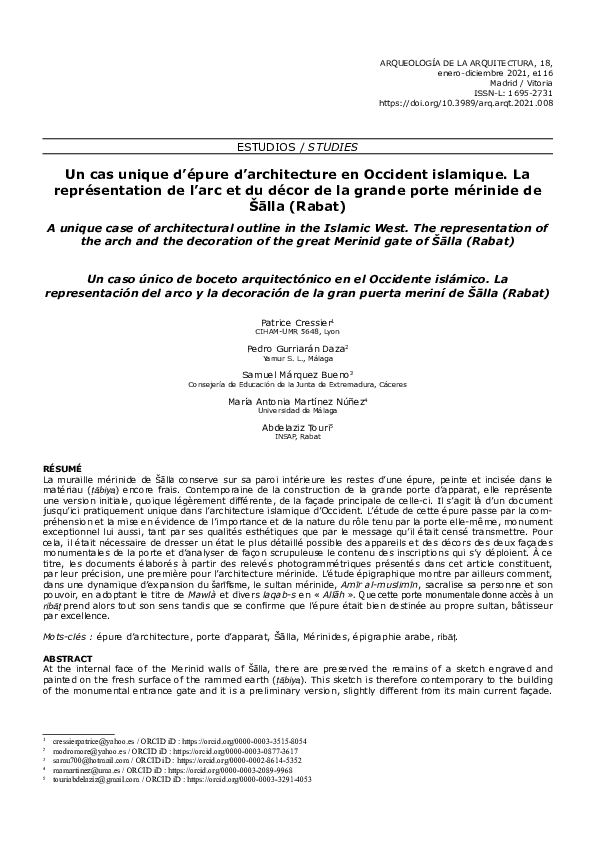 Un cas unique d'épure d'architecture en Occident islamique. La représentation de l'arc et du décor de la grande porte mérinide de Sālla (Rabat). Cressier, Gurriarán, Márquez, Martínez, et Touri.Samuel Márquez Bueno