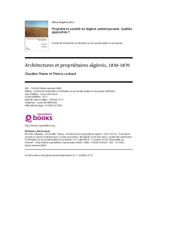 Architectures et propriétaires algérois, 1830-1870Claudine Piaton