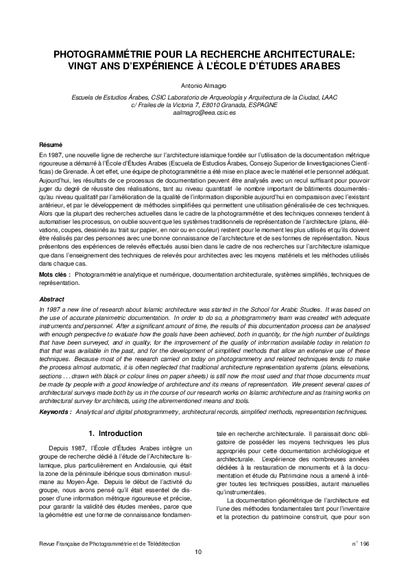 Photogrammétrie pour la recherche architecturale : vingt ans d'expérience à l'Ecole d'Etudes ArabesAntonio Almagro Gorbea