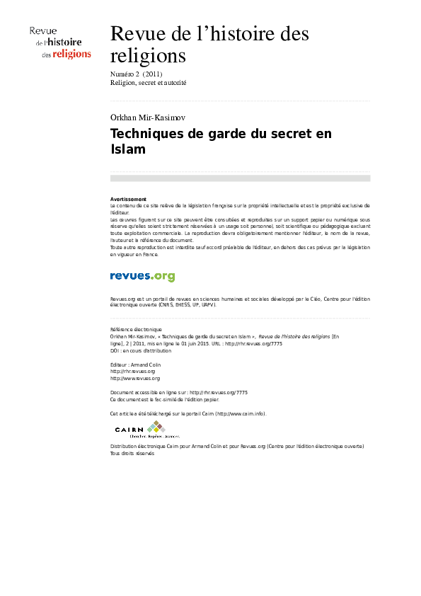 downloadDownload free PDFView PDFchevron_rightTechniques de garde du secret en IslamOrkhan Mir-KasimovRevue de l'histoire des religions, 2011