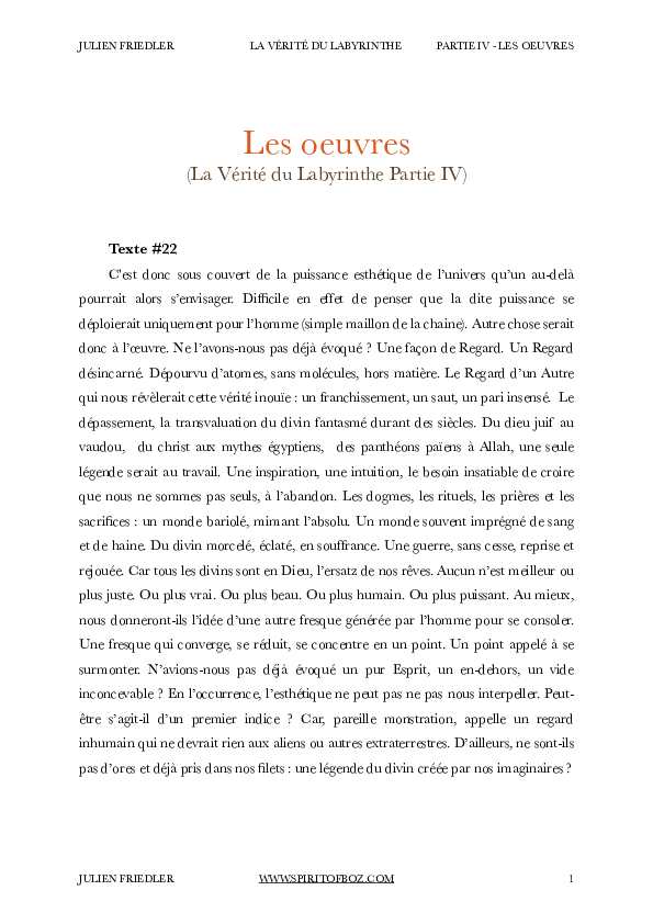 downloadDownload free PDFView PDFchevron_rightLa vérité du Labyrinthe - Partie IV : les oeuvresJulien FriedlerComment expliquer la création d'oeuvres ? Existe-t-il un lien entre le macrocosme et le microcosme ? Le geste de l'artiste d'où vient-il ? Qu'est-ce que le beau ? Autant de questions soulevées dans cette partie.