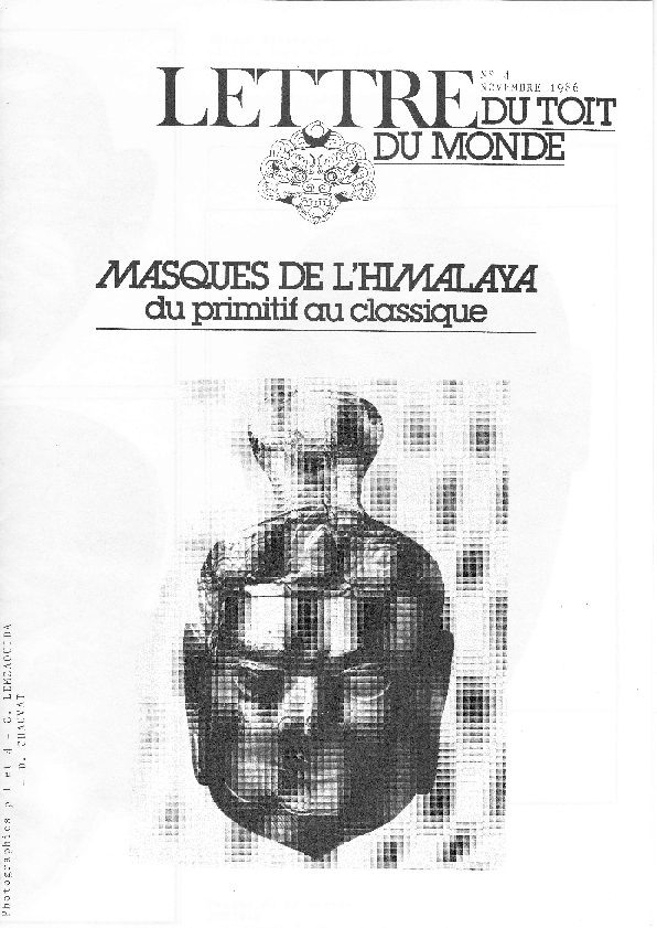 downloadDownload free PDFView PDFchevron_rightLETTRE-TDM-n°4 : MASQUES DE L'HIMALAYA - DU PRIMITIF AU CLASSIQUE (NOVEMBRE 1986) PAR ERIC CHAZOTLETTRES du TOIT du MONDE / HIMALAYA ARCHPrésenter succinctement les masques de l'Himalaya, crest évoquer leur fascinante diversité. De l'archaïsme sauvage à l'élaboration la plus sophistiquée, en passant par toute Ia gamme des patines et des polychromies (patines croûteuses, lustrées, couche de kaolin, couleurs minérales et végétales) et supports les plus surprenants (bois, tissus, champignon, peau d'éléphant, carapace de tortue, fourrure, etc. . . ); leurs fonctions sont aussi variées que leurs formes. Les deux catégories de base que nous aurions envie d'établir par les termes "classiques" et "primitifs" apparaîtraient vite réductrices dans une étude plus longue.