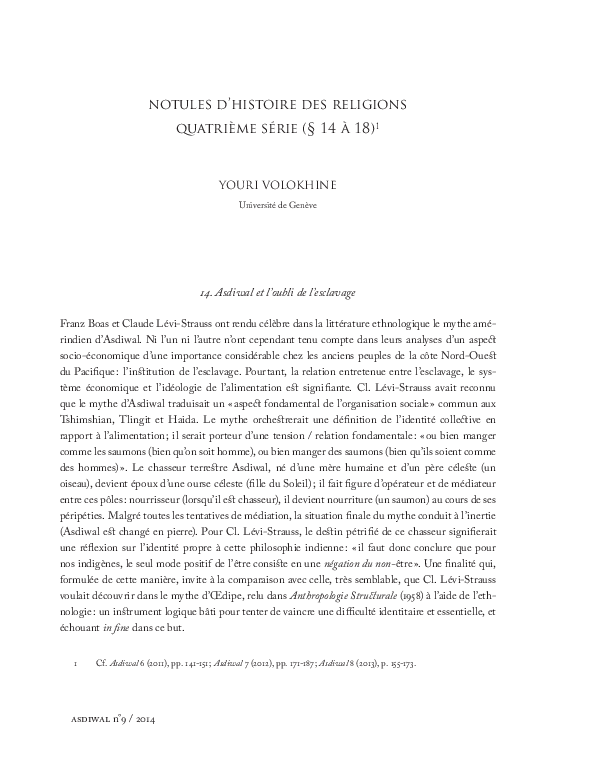 downloadDownload free PDFView PDFchevron_rightNotules d'histoire des religions. Quatrième sérieYouri Volokhine§14. Asdiwal et l'oubli de l'esclavage. § 15. D'oies et de jars: une lettre de Claude Gaignebet. §16. Remarques sur les "races" extra-terrestres. §17. De West Memphis (Arkansas) à Trente: à propos du mythe du "crime rituel". §18. Van Gennep et les puces.