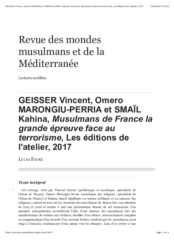 downloadDownload free PDFView PDFchevron_rightGEISSER Vincent, Omero MARONGIU-PERRIA et SMAÏL Kahina, Musulmans de France la grande épreuve face au terrorisme, Les éditions de l'atelier, 2017Lucas FaureRevue des mondes musulmans et de la Méditerranée, 2019