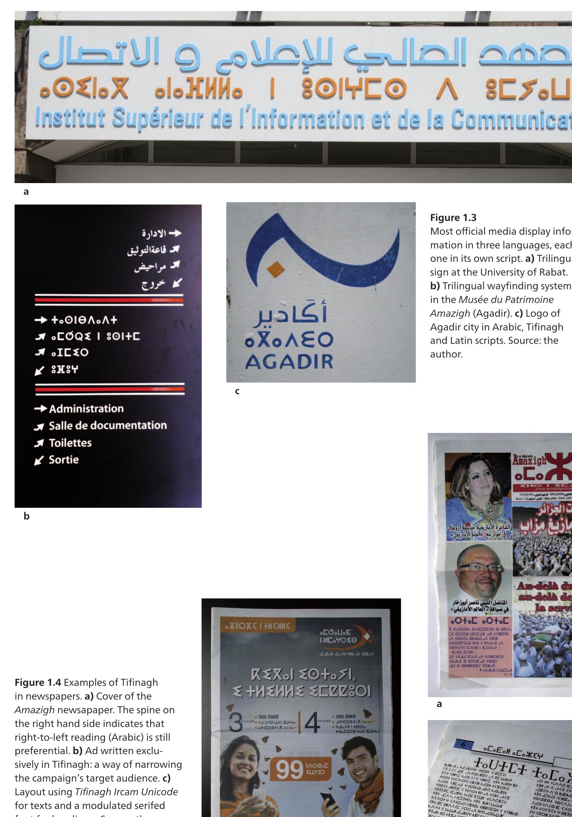 Tifinagh is an ancient script used in several areas of North Africa to write the Amazigh language. This dissertation discusses its context, history and development, and how they influence the making of Tifinagh digital fonts today. It looks particularly into the work of the Moroccan Institut Royal de la Culture Amazighe (ircam) and the challenges associated with the design of typefaces in the context of complex ongoing standardisation processes. Specifically, it analyses the phenomena of cursiveness and bicameralism and the IRCAM’s recent exploration of the possibilities of the Tifinagh script in that direction.