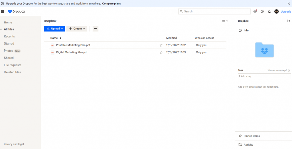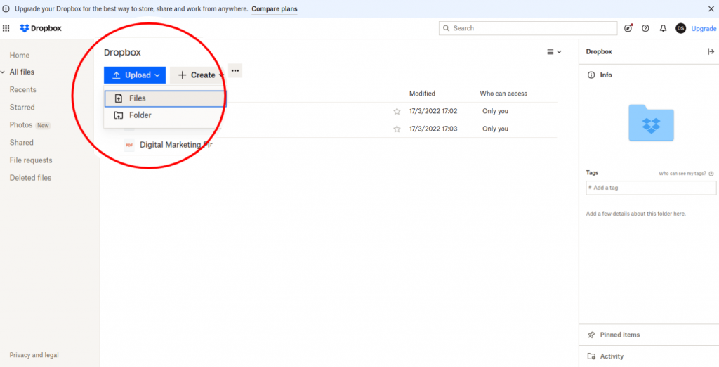 Upload your PDF file by clicking on ‘Upload’ and then on ‘Files.'