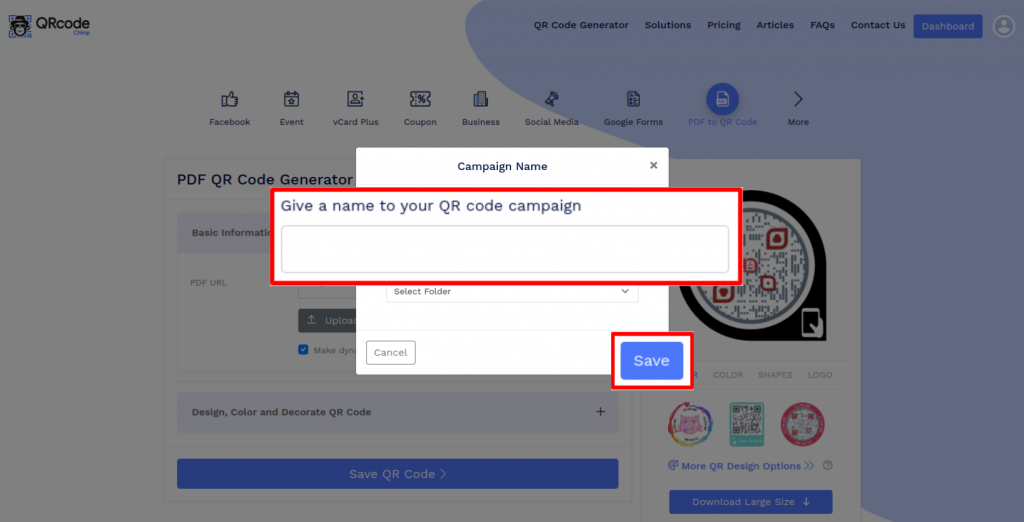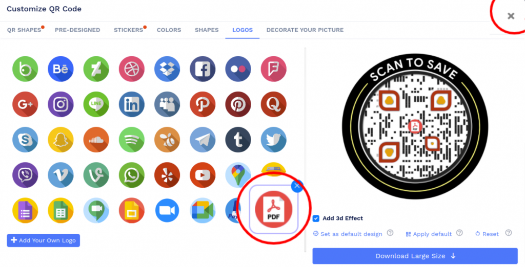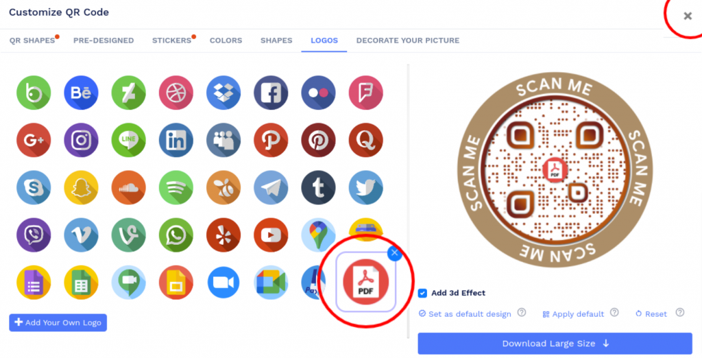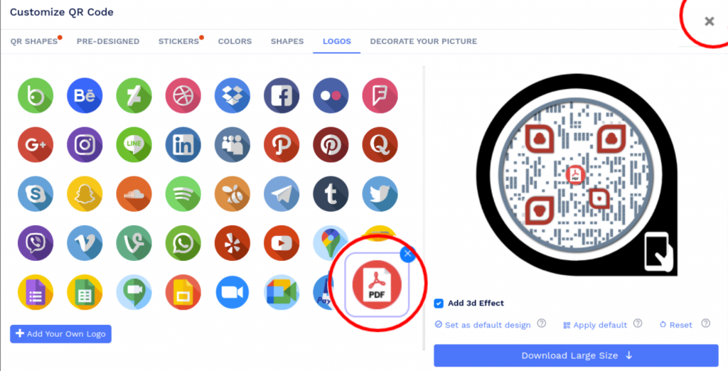 Click on 'Design Color and Decorate QR Code' to customize your QR Code design (ex: adding a PDF logo). Note: Click on the ‘x’ icon of the ‘Customize QR Code’ popup to save changes.