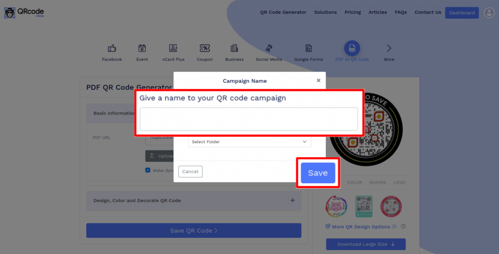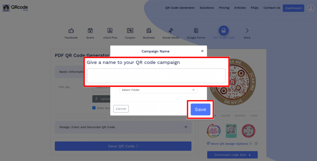 Save the QR Code by clicking on the ‘Save QR Code’ button, entering the QR name and then clicking on ‘Save’. Note: Make sure to scan your QR Code from different devices (iOS and Android) before printing for production.