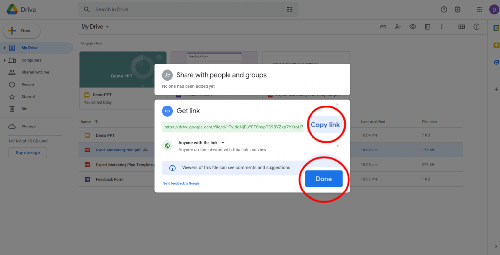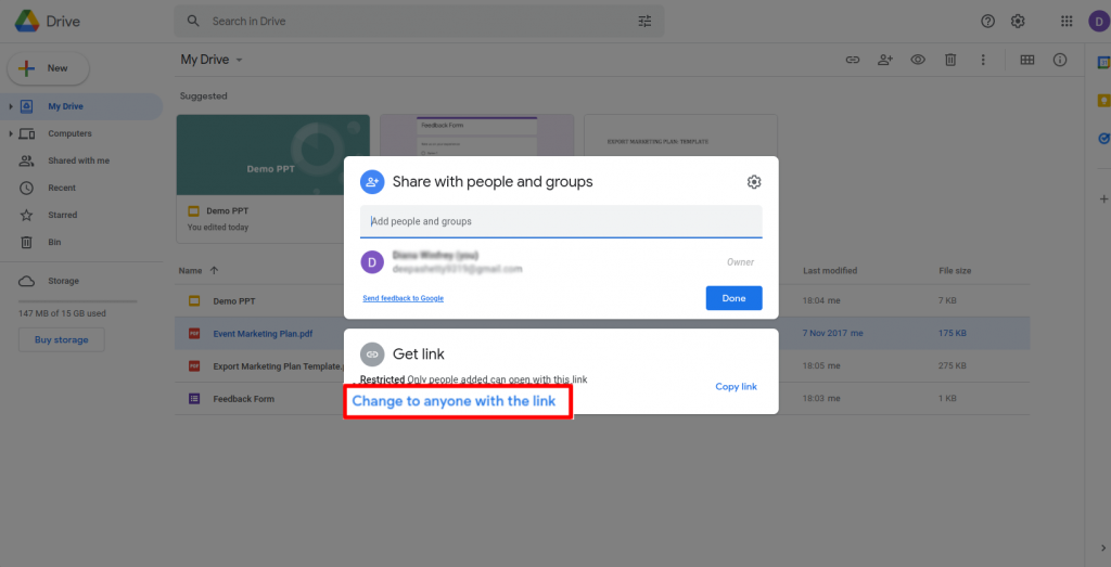 Click on ‘change to anyone with the link’ to ensure the file has access to view by anyone.
