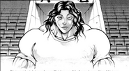 After a while, Hanayama gets up from the ground and both strongmen continue their fight. Hanayama endures the powerful charge from Pickle, who likened his strength to that of a triceratops. The yakuza held back Pickle long enough for Baki to finally arrives and meet the caveman in person. After admiring the "beauty" of Pickle's body that was fully built for hunting, Pickle offered Baki a hand bump similar to the one his father Yuujirou has offered to him at the military base. Baki accepted, but he is suddenly being thrown off balance by Pickle's sheer strength, amusing the caveman. In return, Baki instinctively kicked Pickle in the face, but Pickle seems to not mind about it and even smiles back at him. Baki immediately understands the the caveman wanted him to go back to the Underground Arena with him, and as such he and Hanayama chose to do so.
