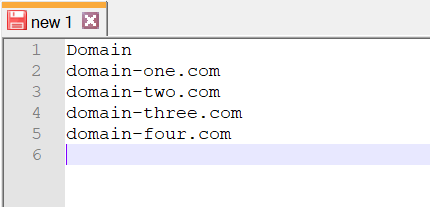 To start, create a CSV file that has a list of all your domains and save it to your desktop (or wherever you like, just make sure you update your script to reference it). All this CSV file needs is a column header named Domain, and then a list of your domains below it, like so:
