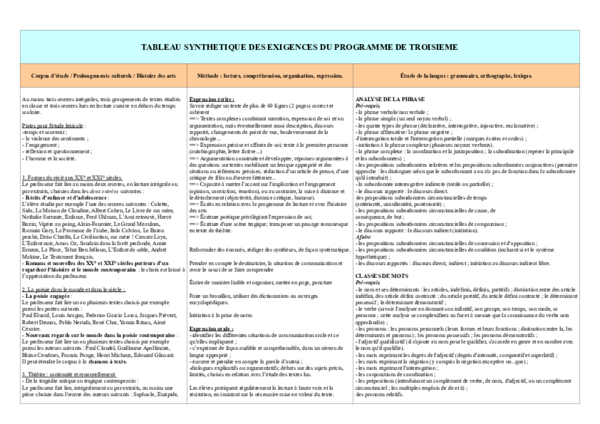 TABLEAU SYNTHETIQUE DES EXIGENCES DU PROGRAMME DE TROISIEME